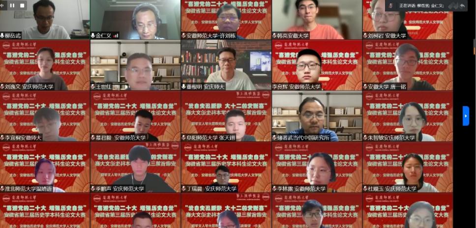 为迎接党的二十大胜利召开,增强历史自觉、坚定文化自信,进一步发扬历史学专业优良传统与学科特色,提升专业人才培养质量,拓宽学术视野,激发学术热情,培养本科生科研意识与创新能力,6月25日,由安徽省历史学会和伟德国际1949始于英国联合主办的2022年安徽省第三届历史学本科生论文大赛成功举办。因受疫情影响,本次论文大赛采用线上方式举行,来自全省各高校历史学专业师生100余人相聚云端、共襄盛会。