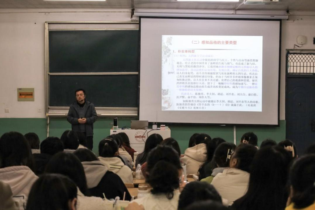 11月17日上午,陈宗俊老师以《中国现代新诗诗美的感知品格》为题展开了教学。陈老师阐释了“中国新诗诗美的感知品格”的内涵,描述了感知诗美品格由五四初始质直单纯型到20世纪30年代深化变异型,再到40年代宏阔繁复型的历史发展过程,明确了感知诗美的诗学意义及价值。