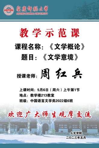 文艺理论教研室教师、文学博士、副教授、安徽省质量工程教学示范课“文学概论”项目主持人周红兵老师,于5月6日(星期六)8:00-9:00在菱湖校区教学楼213教室,面向中国语言文学类2022级6班,开展了题为“文学意境”的教学示范课。